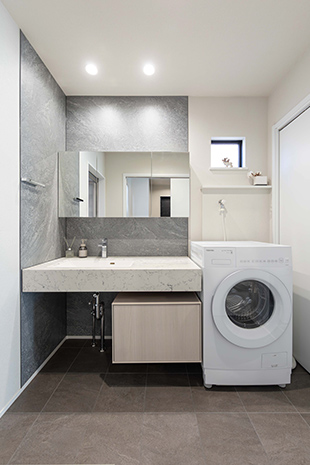 【洗面所・脱衣所】上質でホテルライクな雰囲気の洗面室。シンプルながらも素材の質感を愉しめる水まわりスペースとなっています