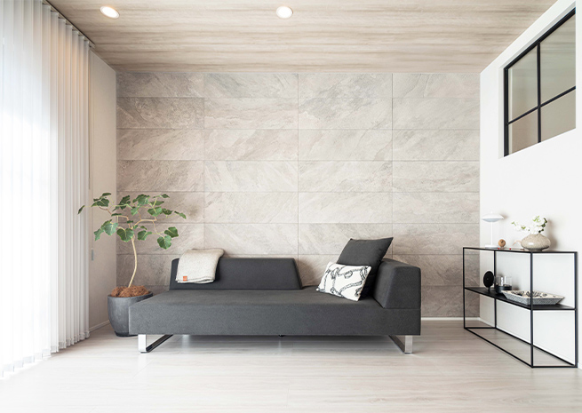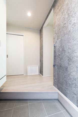 【玄関】一面にグレーの調湿タイルを貼って、デザイン性を高めました。消臭効果も兼ね備え、訪れる人を気持ちよく迎えてくれます
