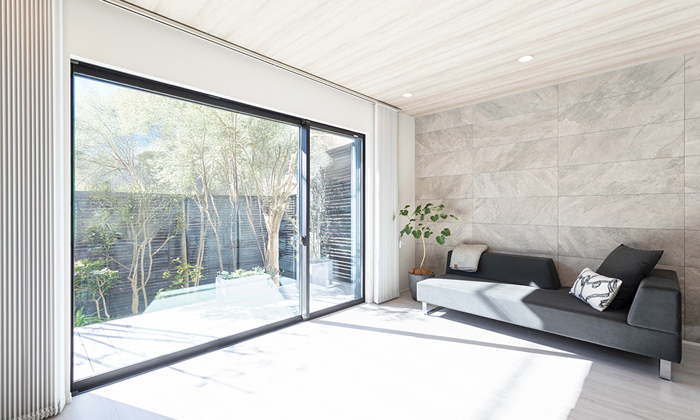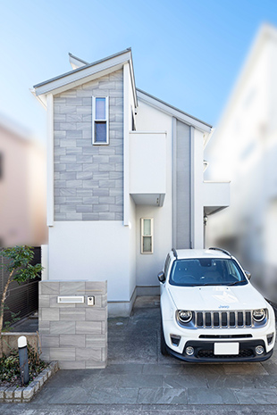 【外壁外装・屋根】内装と合わせて、外観も落ち着いたモダンスタイルに。前面に貼ったタイルが高級感を演出しています