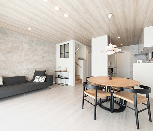 【キッチン・システムキッチン】グレーや木目を組み合わせて落ち着いた雰囲気に。LDKとキッチンの天井を同じデザインにすることで、広く伸びやかな空間を演出しています
