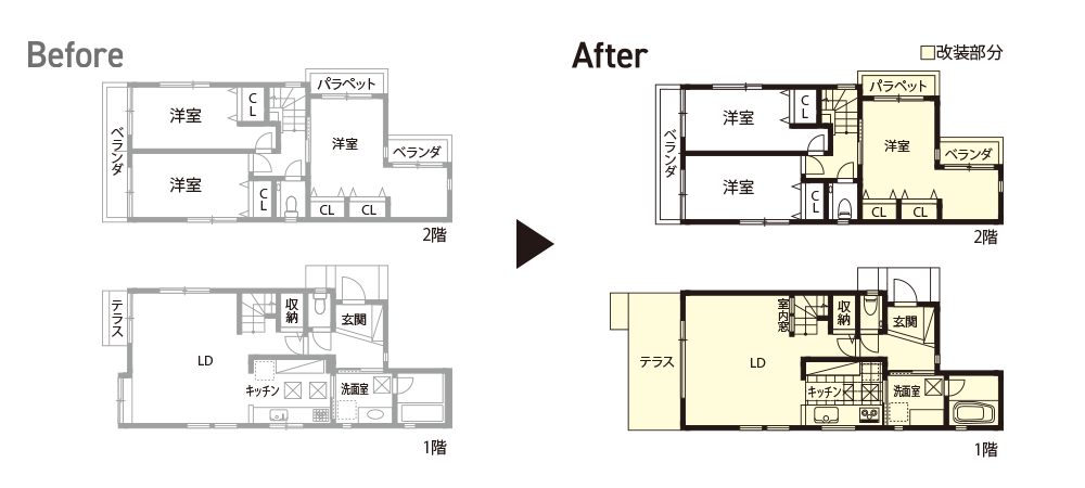 - 2×4でも大規模リフォームを実現。壁をなくし窓を大きくすることで開放的なLDKが誕生