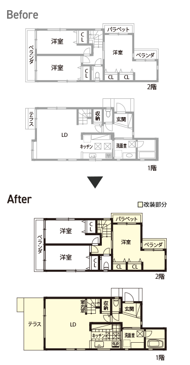 水まわり設備や内装の傷みが気になり始めたため、リフォームを検討されたSさま。LDKのテラス側の壁にある二つの窓をつなげ開口部を広げて、明るくしたいともお考えでした。