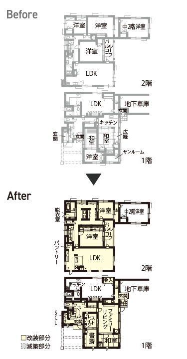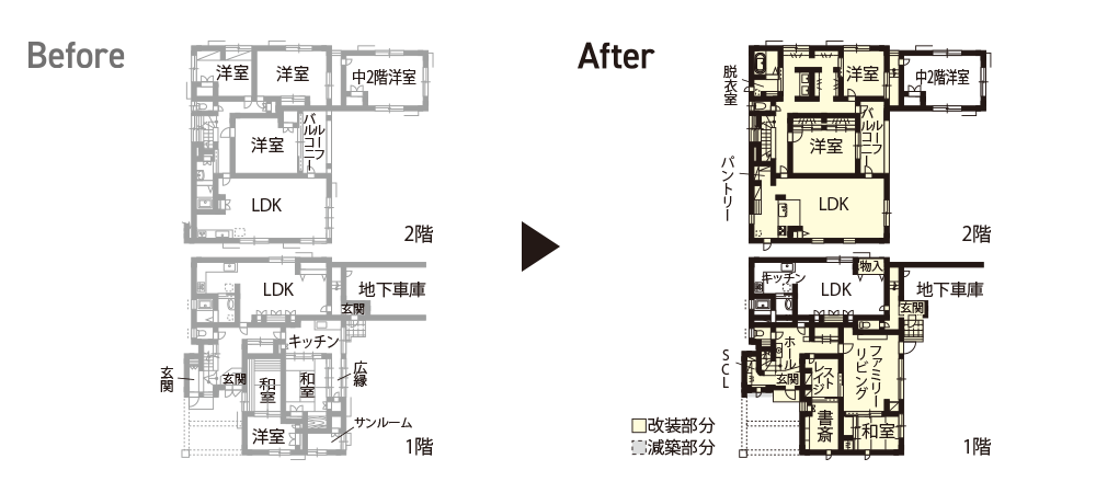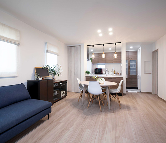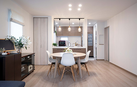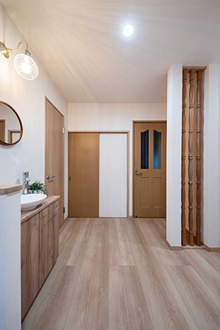 まず、標準仕様に含まれる耐震工事で耐震性能を大幅にアップ。2階のLDKはキッチンを対面式に変更し、お子様を見守りやすい空間に。また、洗面室からランドリールーム、ファミリークロゼットへと続く家事動線をつくり、「洗う・干す・しまう」がスムーズに。