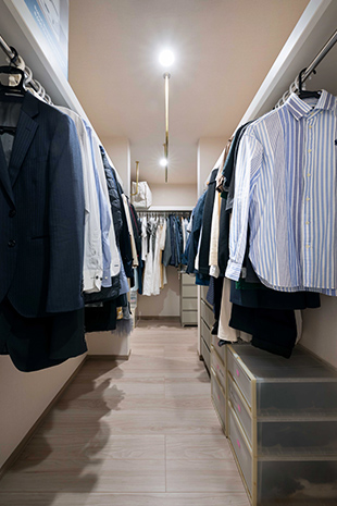 【ファミリークロゼット】洗面室・ランドリールームとつなげ、スムーズな洗濯動線に。シューズクロークやパントリーなど細やかな計画で、お住まい全体の収納力もアップしています