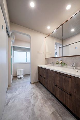 【洗面室】忙しい時間帯でも快適に使うことができるよう、2階の洗面室には洗面ボウルを二つ設置。写真の奥はランドリールームとなっており、身支度のスムーズな動線も叶えました