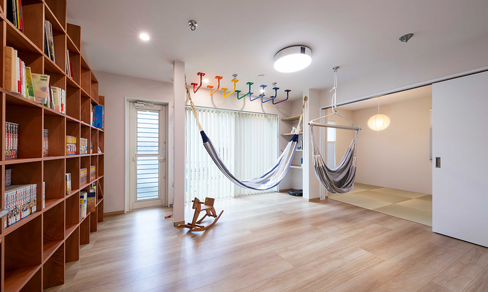 【洋室】以前は祖父母様がお住まいだった1階は、うんていやハンモックを設置して遊び心のあるファミリーリビングに生まれ変わりました。本棚は抜け感のある軽やかなものをセレクト。「お友達が来た時も、楽しい遊び場として大活躍です。」