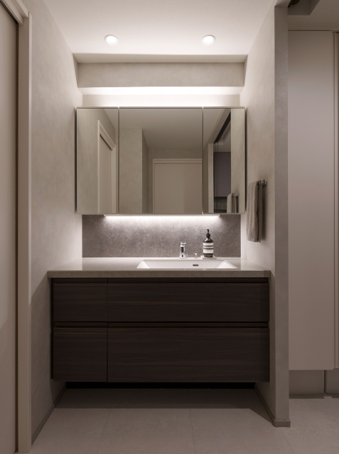 【洗面所】下部がオープンになったフロートタイプの洗面化粧台は、床面を見せるすっきりとしたデザインで空間を広く感じさせます