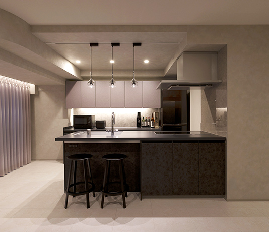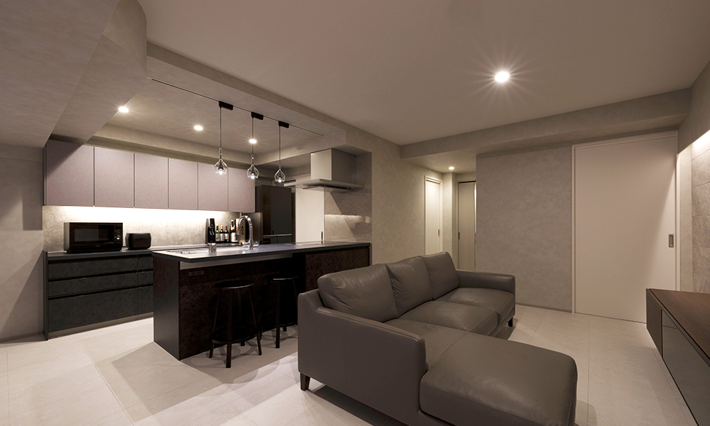 書斎や可変性のある子ども部屋を設け、半独立型だったキッチンはオープンキッチンに一新し、ゆとりのあるLDKを実現。内装は、落ち着きのあるグレージュ・ダークグレーを基調に、タイルや間接照明を取り入れたラグジュアリーな空間へ。水まわりもデザインと機能性を両立した設備を採用し、ホテルライクなお住まいに生まれ変わりました。