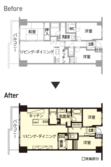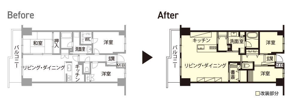 【間取り変更・スケルトン】キッチンを移動させて開放的なLDKへ。個室のサイズを見直し、書斎スペースも生まれました