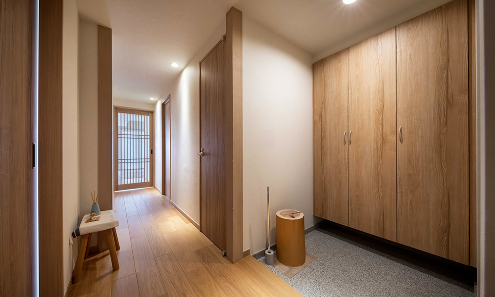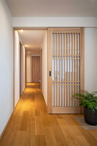 希望されたのは木の質感が感じられるお住まい。和室を取り込み広がりを持たせたLDKは、和の趣きを感じる上質な雰囲気に。床材や格子の扉、付け柱など素材やデザインひとつひとつにまでこだわり、Sさまが理想とされていた日本建築の落ち着きを演出。