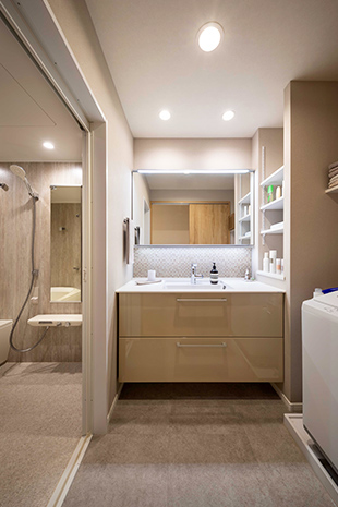 【洗面所】グレージュを基調とした落ち着いた雰囲気に。壁にはタイルを貼ってアクセントをプラス