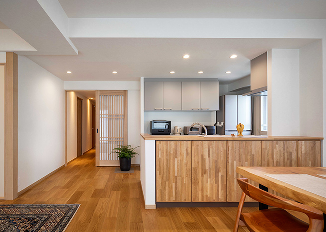 【キッチン・システムキッチン】キッチンカウンターには、オリジナルの無垢材収納を造作。LDKの扉も同じ素材で格子戸を仕立て、全体に統一感を持たせました。グレージュのキッチンと木の質感が調和し、上質な雰囲気を演出しています