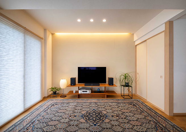 【リビング・ダイニング】テレビ背面の壁には珪藻土を採用。LDKの雰囲気を引き締めるアクセントに。間接照明に照らされるとやわらかな陰影が浮かび上がり、和の趣きを感じられます